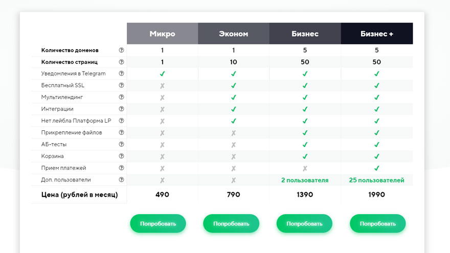 Тарифы, прямо скажем, странные, неоправданно дорогие. Почему так? Первые 2 из них позволят создать по 1 посадочной странице на нормальном домене. По сути, микро-тариф вообще не нужен, учитывая его ограничения. Тариф «бизнес» без приёма платежей и с его 50 страницами позволит положить на домен лишь 5 страниц. Странно, но тариф «бизнес+» тоже ограничивается лишь 5 рабочими лендингами на своих доменах, зато полностью раскрывает функционал системы. 1 и 3 тарифы можно выбросить, совсем.