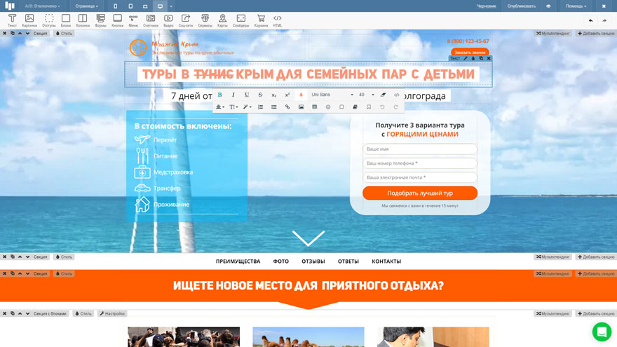 Дело в том, что вы будете выстраивать ваш лэндинг из готовых секций разнообразного назначения (шапка, картинка, меню, бренды, подвал и т. п.) и виджетов, которые можно расположить в произвольном порядке. Далее детально настраиваем внешний вид для каждого блока. Это мега-удобно. Особенно для новичков.