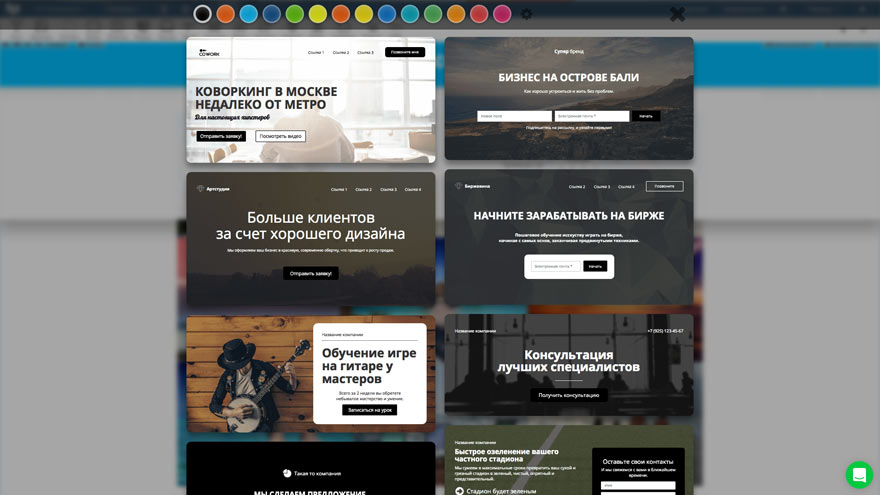 Из названия чётко понятно, для чего та или иная секция предназначена. Кликнув по любому из блоков, вы сможете выбрать формат вывода для него (порой количество вариантов превышает десяток), а также цветовую схему – одну из 11. Всё это позволяет настолько сильно разнообразить подачу информации, что ваши лэндинги действительно смогут претендовать на уникальный дизайн. Шаблоны здесь не нужны.