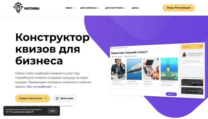МАТОМБА — это профильный конструктор квизов, работает с 2019 года, обеспечивает весьма неплохой функционал. Здесь есть исчерпывающий набор разных типов вопросов, режим тестирования (когда вопросы каждый раз перемешиваются случайным образом и собирается статистика по ответам, как в опросах), условные переходы между экранами и встроенная CRM-система.