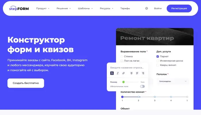Самая функциональная платформа для создания интерактивных квизов, форм и калькуляторов. Сервис помогает вовлекать пользователей, собирать заявки и повышать конверсию сайта за счёт продуманного геймифицированного интерфейса. В StepFORM можно настраивать дизайн, сценарии прохождения и интеграции с CRM или мессенджерами. Это идеальный инструмент для маркетологов, фрилансеров и бизнеса, который хочет превратить посетителей сайта в клиентов.