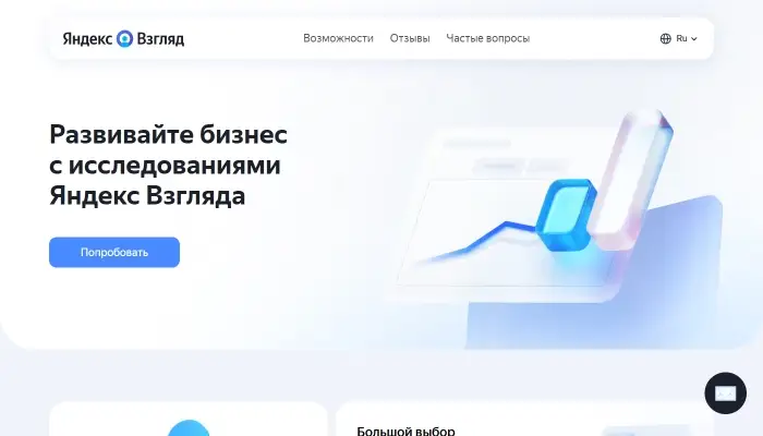 Яндекс.Взгляд — изначально сервис специализировался только на проведении простейших типовых исследований по аудитории поисковика Яндекса (теперь это отдельный сервис Яндекс.Аудитории). Чуть позже появился функционал расширенных исследований и опросов по своей/внешней аудитории.
